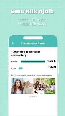 Sebagai contoh, kumpulan foto yang sebelumnya berukuran lebih dari 1 GB bisa diperkecil hingga hanya beberapa ratus MB setelah melalui proses kompresi. Dengan begitu, ruang penyimpanan di smartphone menjadi lebih lega tanpa harus menghapus foto penting.
