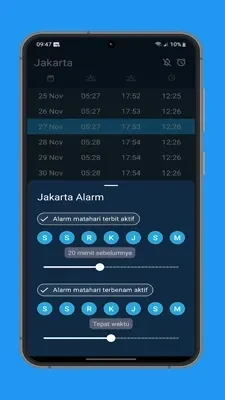 Selain alarm manual, aplikasi juga menyediakan notifikasi otomatis setiap hari berdasarkan lokasi Anda. Sistem akan memberi tahu kapan waktu terbaik untuk melihat matahari terbit atau terbenam tanpa perlu mengatur alarm secara manual.